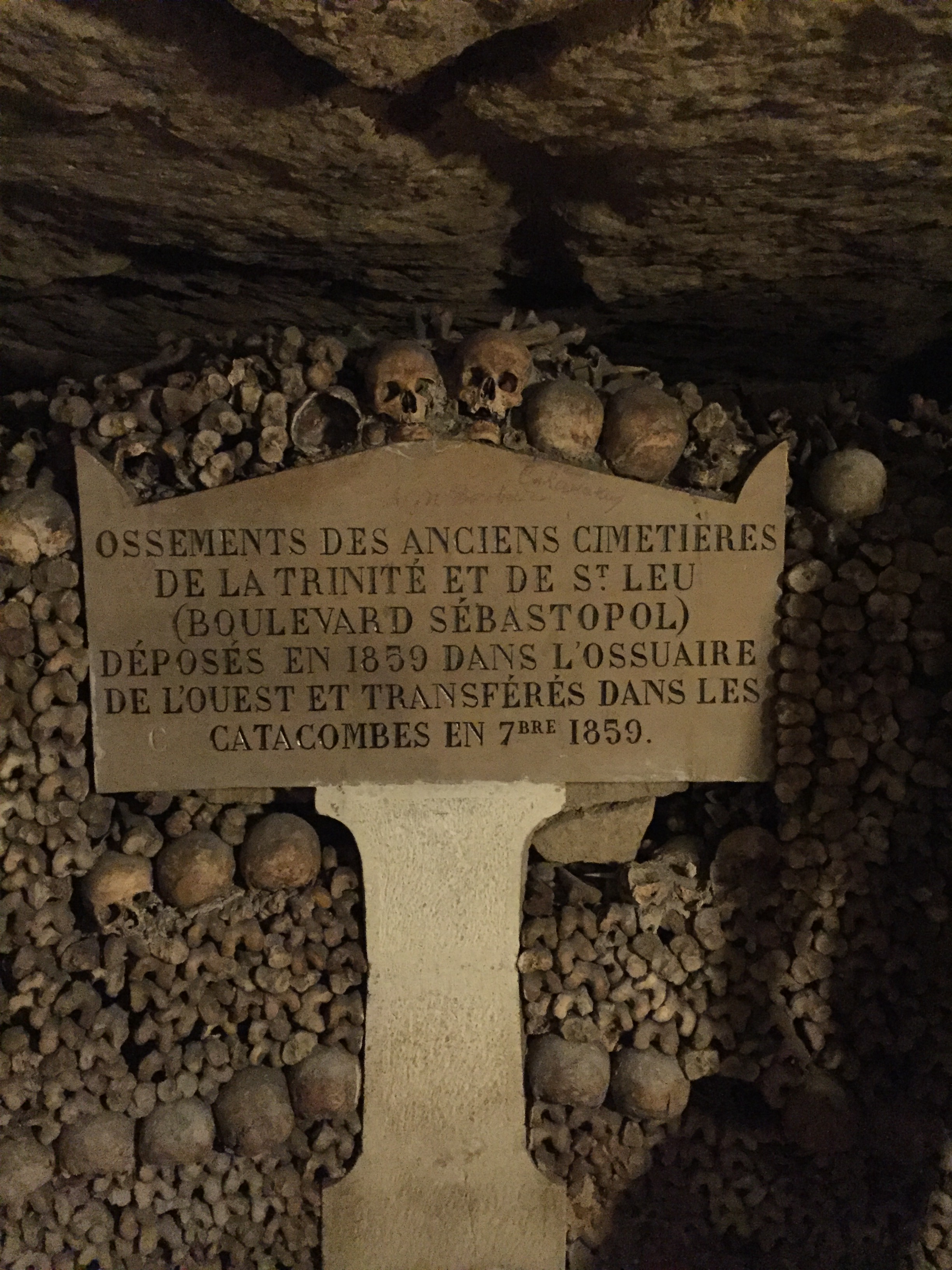 The tour begins with you winding down a long spiral staircase, deep down into the pit of the catacombs. These underground ossuaries hold the remains of more than six million people. The ossuary that holds the bodies was created because the city of Paris had a problem with overflowing cemeteries. After a series of basement wall collapses from the Saint Innocents-cemetery-quarter in 1774, this added a sense of urgency to the overflowing cemetery problem they had. Beginning in 1786, workers would proceed down the streets nightly to drop off covered wagons full of remains from the Paris cemeteries.